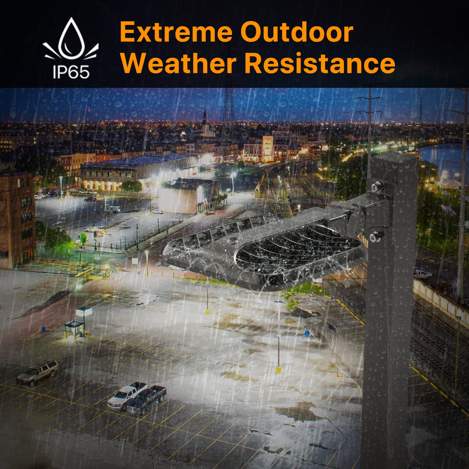 - Outdoor Performance: IP65 rating against dust and water ingress, no-flickering safe design, good heat dissipation,this street area lighting works well in extreme weather, rainstorm and snowstorm.